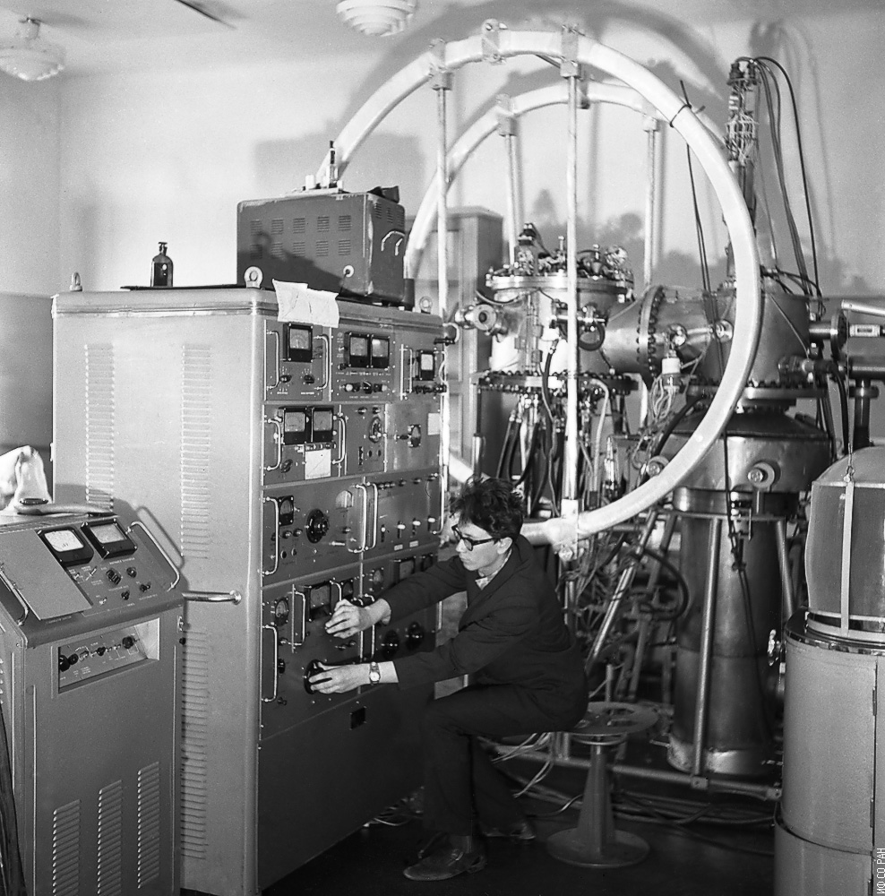 Худяков А. Е., ведущий технолог лаборатории высокочастотных и импульсных свойств тонких магнитных пленок Института физики им. Л.В. Киренского Сибирского отделения Академии наук СССР (ИФ СО АН СССР), за работой на высоковакуумной установке для напыления пленок УНУ-1, которая была усовершенствована сотрудниками лаборатории.
