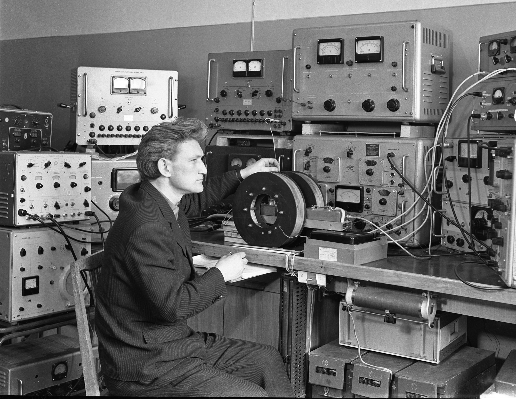 Мальцев Вадим Константинович, младший научный сотрудник лаборатории высокочастотных и импульсных свойств тонких магнитных пленок Института физики им. Л.В. Киренского Сибирского отделения Академии наук СССР (ИФ СО АН СССР), за установкой по импульсному перемагничиванию тонких магнитных пленок, фото 1974 года.