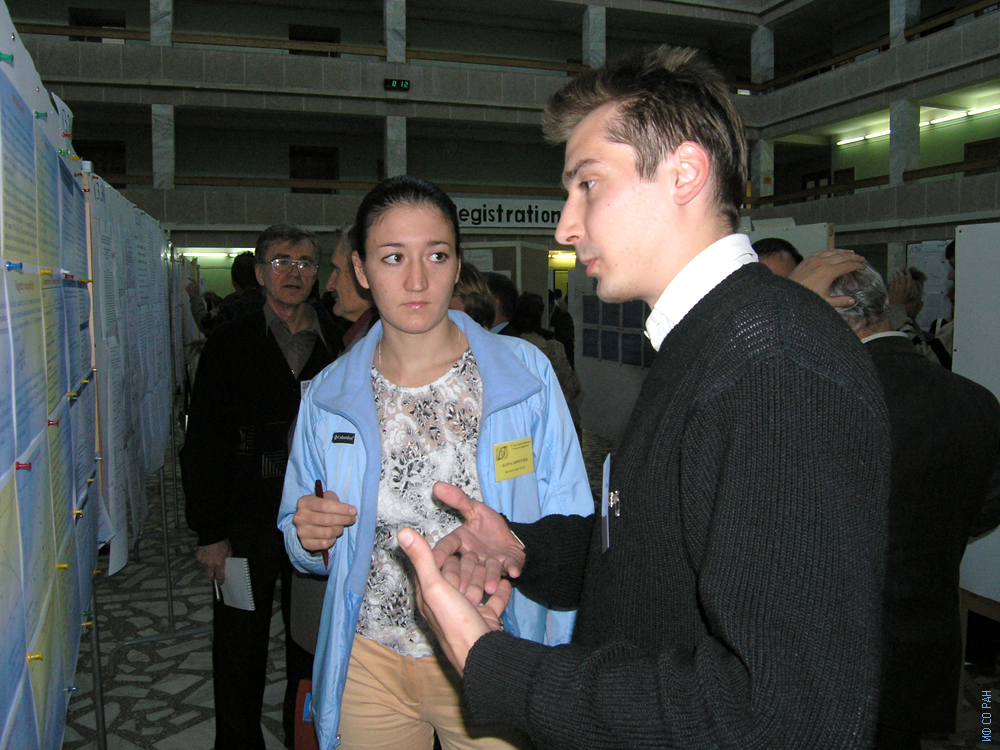 2004 год, 24-27 августа. Шнейдер Елена Игоревна, младший научный сотрулник лаборатории физики магнитных явлений Института физики им. Л.В. Киренского Сибирского отделения Российской академии наук (ИФ СО РАН), дает пояснения у стендового доклада на Евро-Азиатском симпозиуме «Прогресс в магнетизме» (ЕASTMAG-2004), Красноярск.