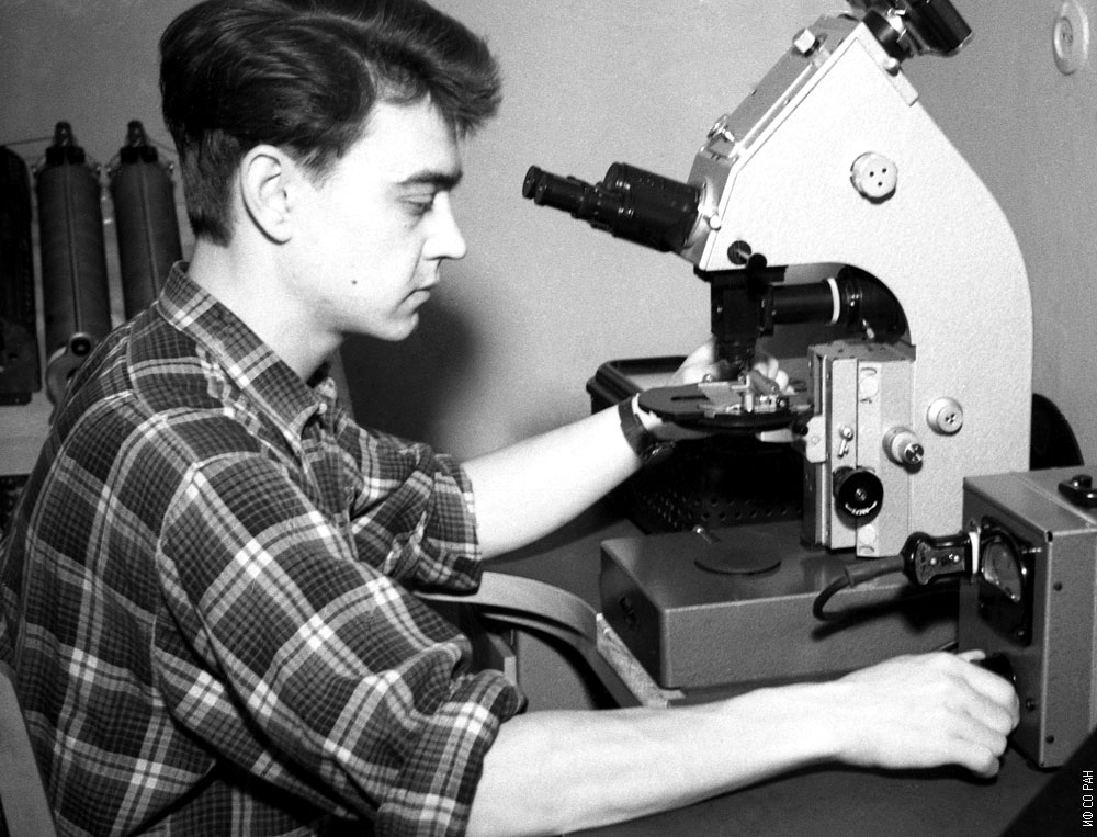 Тропин Ю.Д., младший научный сотрудник лаборатории магнетизма горных пород и геофизики Института физики Сибирского отделения Академии наук СССР (ИФ СО АН СССР). Фото 1963 года. Красноярск.