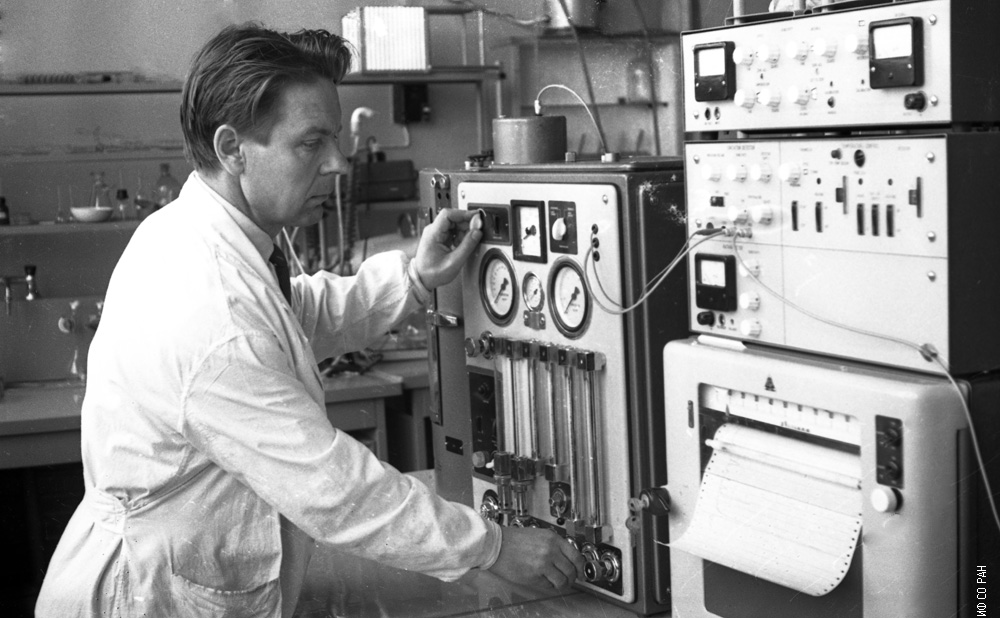 Трубачев Иван Николаевич, старший научный сотрудник, руководитель группы биохимии лаборатории биофизики Института физики им. Л.В. Киренского Сибирского отделения Академии наук СССР (ИФ СО АН СССР,) исследует спектр поглощения хлорофилла водоросли хлореллы, фото 1975 года. Красноярск.