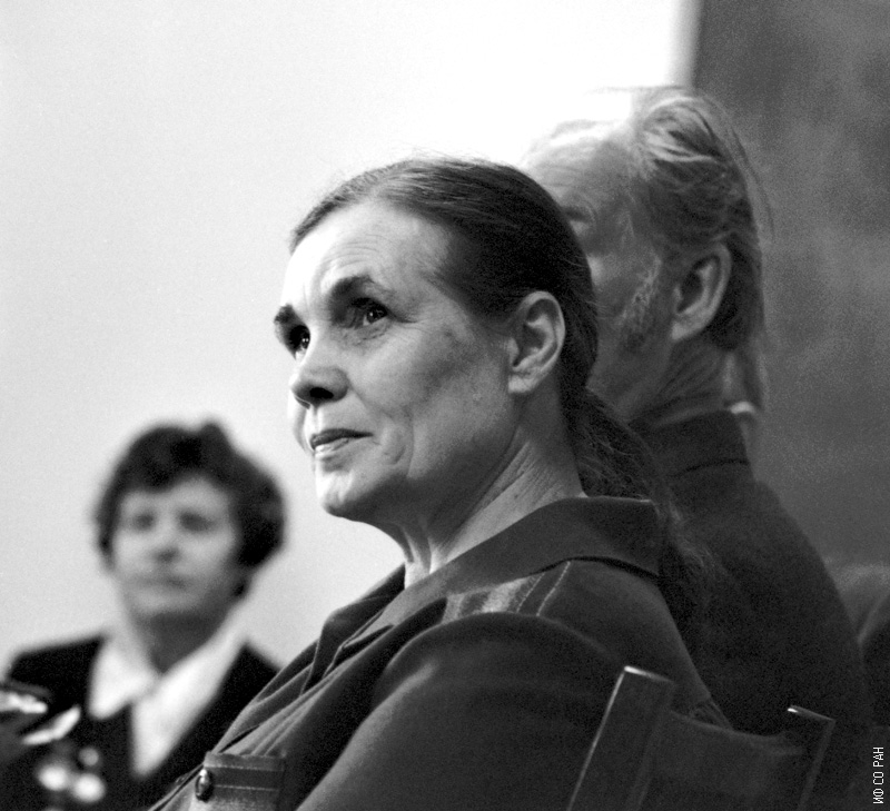 На переднем плане Власова П. Л. в конференц-зале Института физики им. Л.В. Киренского Сибирского отделения Академии наук СССР (ИФ СО АН СССР) 9 мая 1975 года в День Победы в Великой Отечественной войне (1941-1945 гг.). Красноярск.