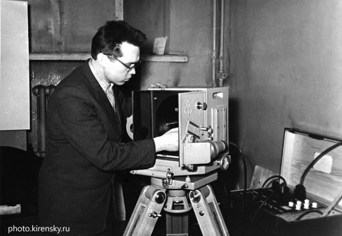 1961 год. Спиров Владислав Викторович, сотрудник лаборатории биофизики Института физики Сибирского отделения Академии наук СССР (ИФ СО АН СССР), у созданной им установки для съемки воздушных фильтров на железной дороге. Съемка позволила определить преимущество воздушных фильтров перед масляными.