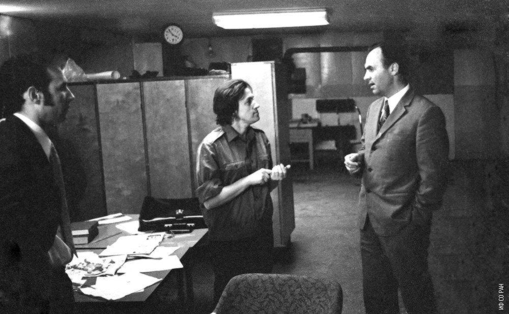 На фото, кадр из фильма, снятый Красноярской киностудией документальных фильмов о научном шестимесячном эксперименте на установке «БИОС-3", проведенном отделом биофизики Института физики им. Л.В. Киренского Сибирского отделения Академии наук СССР (ИФ СО АН СССР), в 1973 году по созданию замкнутых систем жизнеобеспечения. Слева направо: Терских В.В., Шиленко М.П., участники эксперимента и Лисовский Г.М., заведующий лабораторией управляемого биосинтеза.