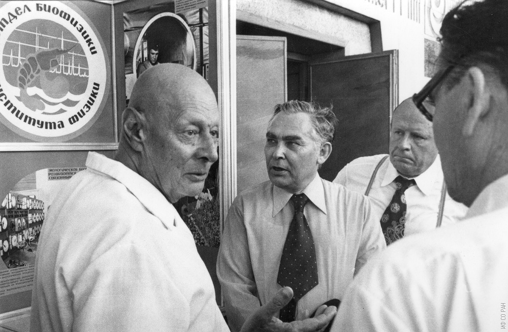 Терсков И.А., директор Института физики им. Л.В. Киренского Сибирского отделения Академии наук СССР (ИФ СО АН СССР) (в центре), в отделе биофизики во время посещения Президентом АН СССР Александровым А.П. (слева) Института физики в 1977 году. Красноярск.