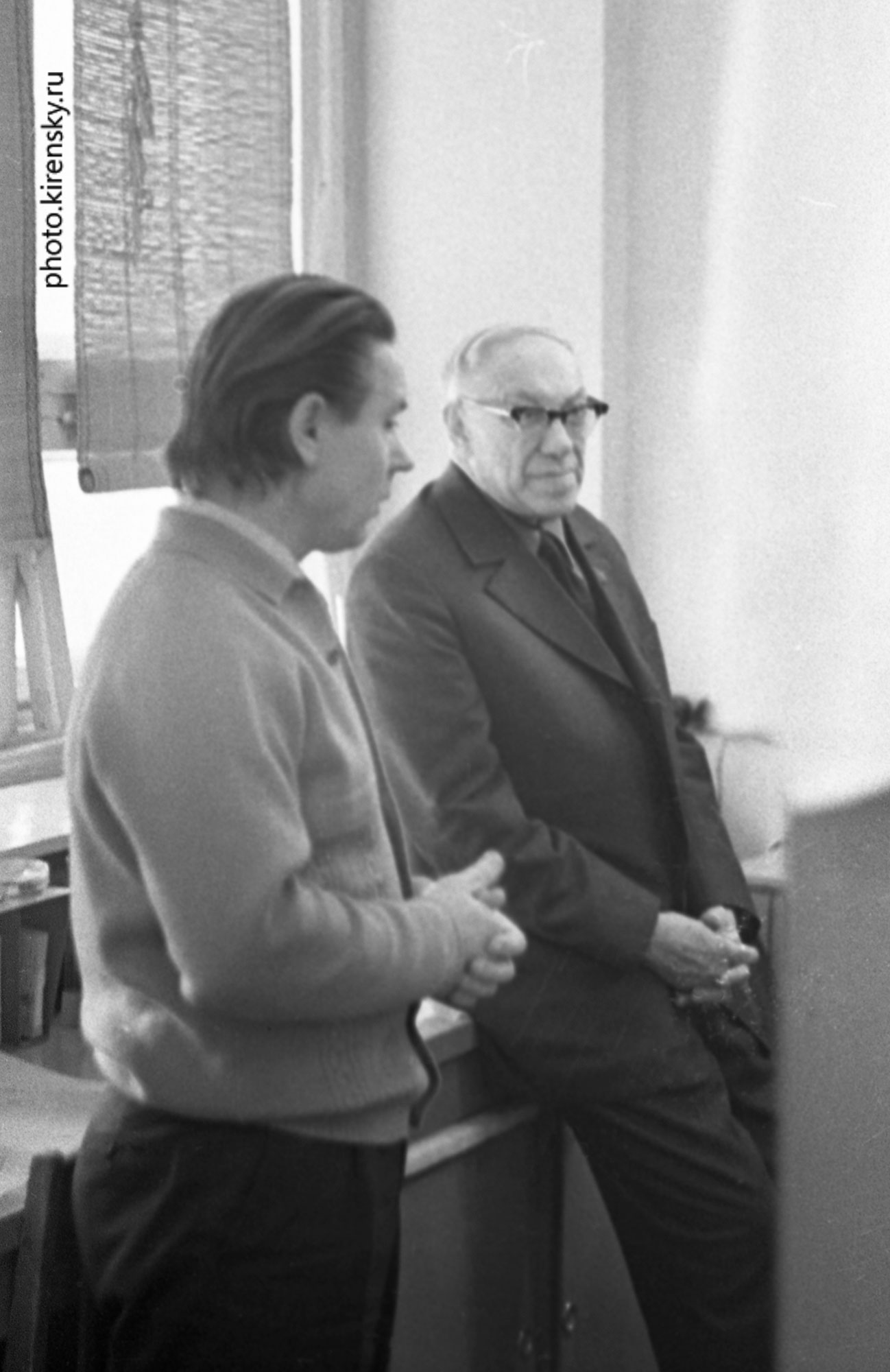 В 1980 году академик М.А. Лаврентьев, во время визита в Красноярск, посетил отдел биофизики Института физики Сибирского отделения АН СССР. На снимке: старший научный сотрудник отдела биофизики Трубачев И.Н. (слева) и академик Лаврентьев М.А. Красноярск.