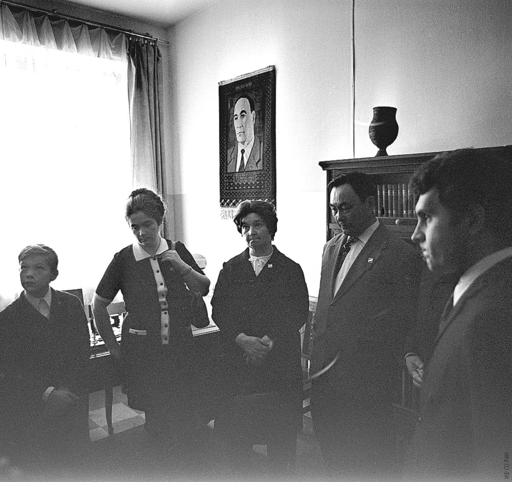 В день открытия памятника академику Л. В. Киренскому 4 ноября 1974 года его родные посетили мемориальную комнату Леонида Васильевича, организованную в Институте физики, носящего его имя. На снимке, слева направо: внук Юрий, дочь Татьяна, супруга Зинаида Яковлевна, Р.Г. Руха, близкий друг Леонида Васильевича со студенческих лет, Ю.В. Захаров, ученый секретарь института. Красноярск.
