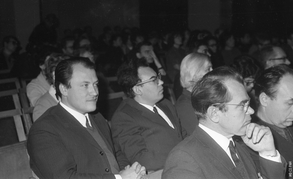 На общеинститутском физическом семинаре в Институте физики им. Л.В. Киренского Сибирского отделения Академии наук СССР (ИФ СО АН СССР). В первом ряду слева Ковров Б.Г., во втором ряду Габуда В.П., (слева) и Саланский Н.М. Фото 1970 года. Красноярск.