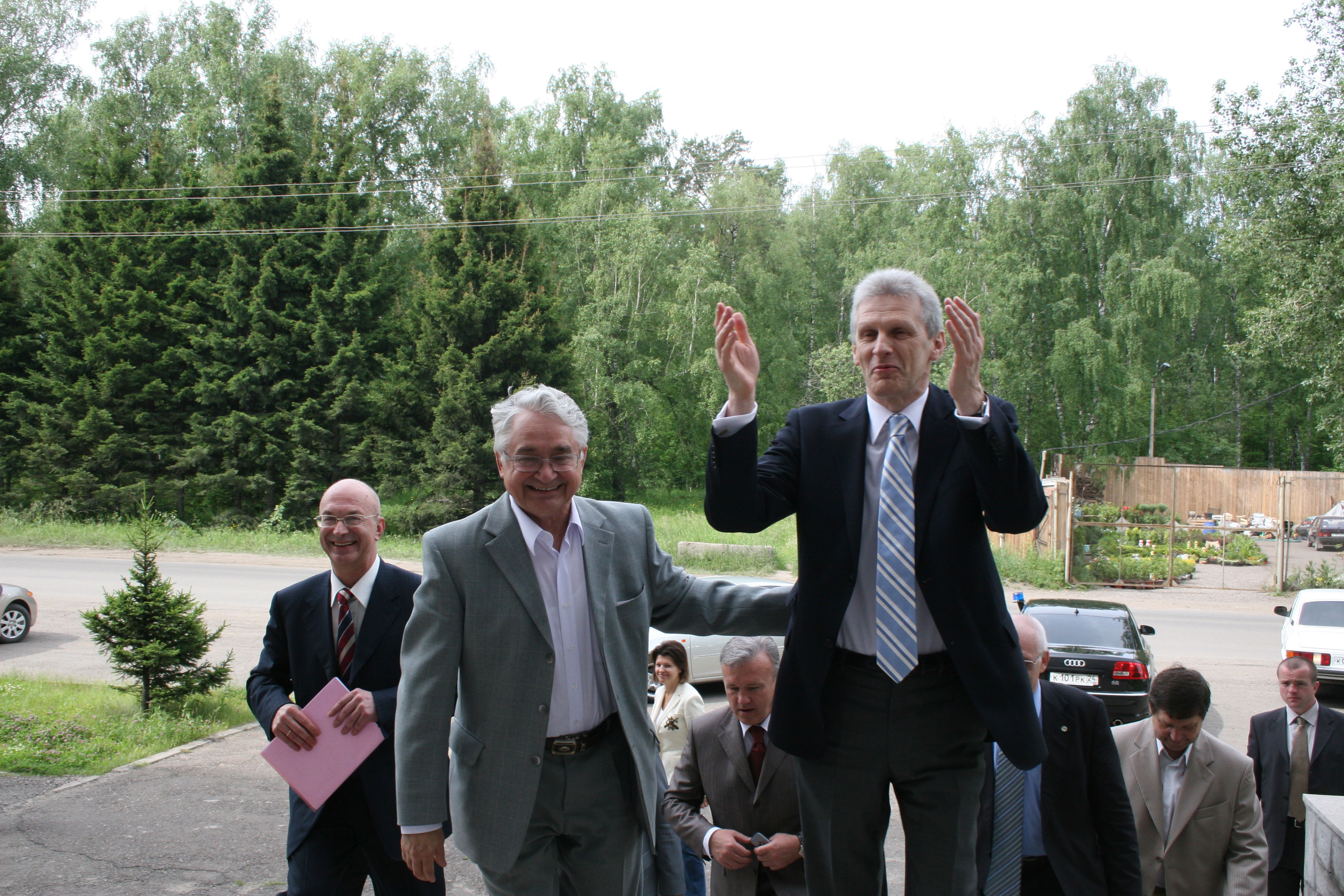 2006 год. На переднем плане академик В.Ф. Шабанов (слева), председатель Президиума Красноярского научного центра Сибирского отделения Российской академии наук (КНЦ СО РАН) и А.А. Фурсенко, министр образования и науки Российской Федерации. Слева академик Е.А. Ваганов, ректор Сибирского федерального университета (СФУ).