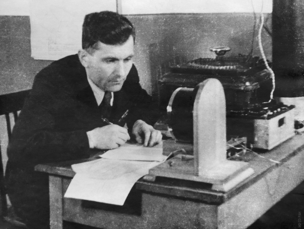 А.Я Власов в магнитной лаборатории Красноярского педагогического института, за установкой по исследованию температурной зависимости магнитострикции никеля методом автоматической фотозаписи, 1956 г.