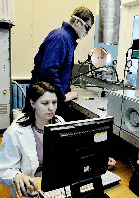 Сотрудники лаборатории аналитических методов исследования вещества Института физики им. Л.В. Киренского Сибирского отделения Российской академии наук (ИФ СО РАН) Внукова Н.Г. и Колоненко А.Л. Установка для спектрального анализа состава вещества. Фото 2010 года. Красноярск.