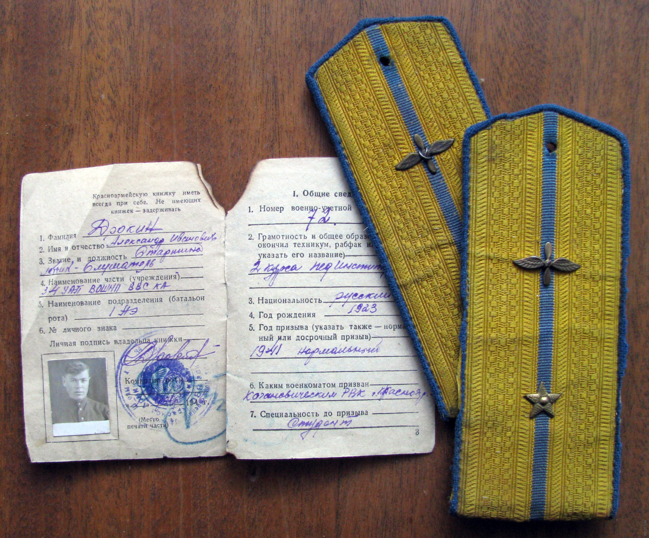 Воинская книжка и погоны старшины-летчика Дрокина А.И.