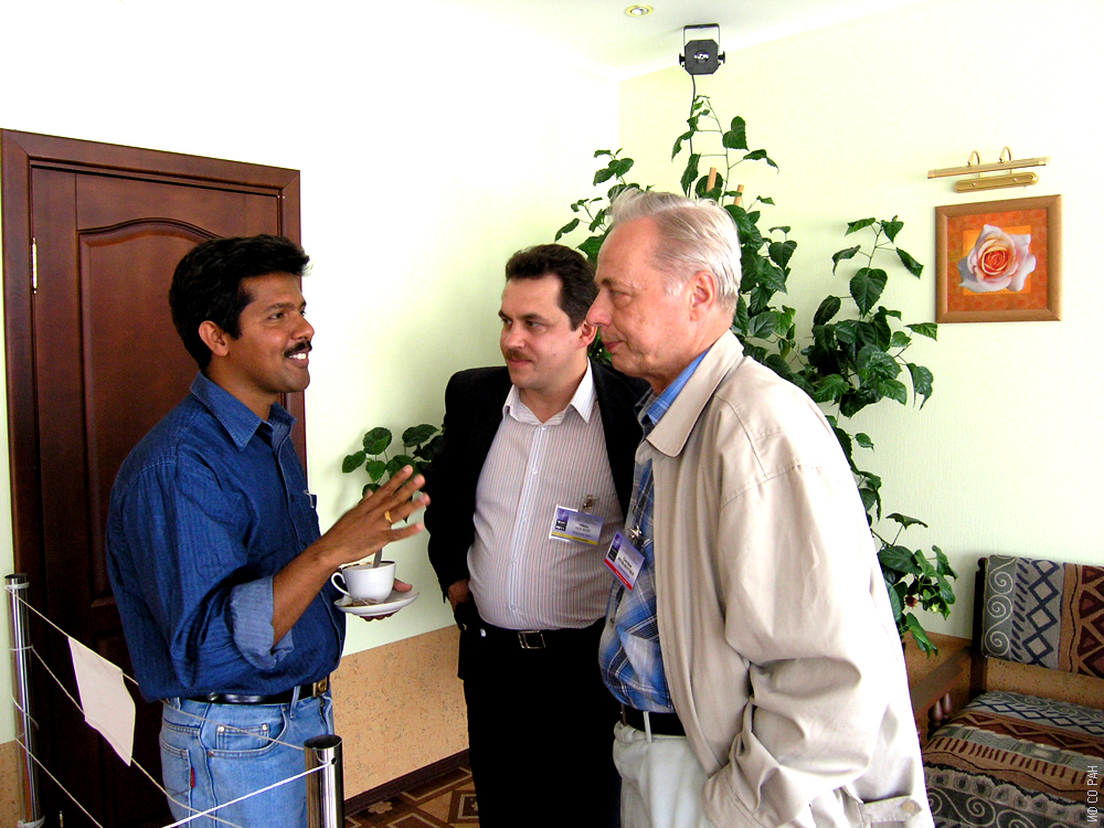 Слева направо: Ша Валлоппилли, профессор технического университета Мюнхена, и сотрудники Института физики им. Л.В. Киренского Сибирского отделения Российской академии наук (ИФ СО РАН) Волков Никита Валентиновичи и Петраковский Герман Антонович на Международном семинаре NATO Workshop "Smart Materials for Ranging Systems (Современные материалы для применения в качестве датчиков)". Красноярск, август 2004 года.