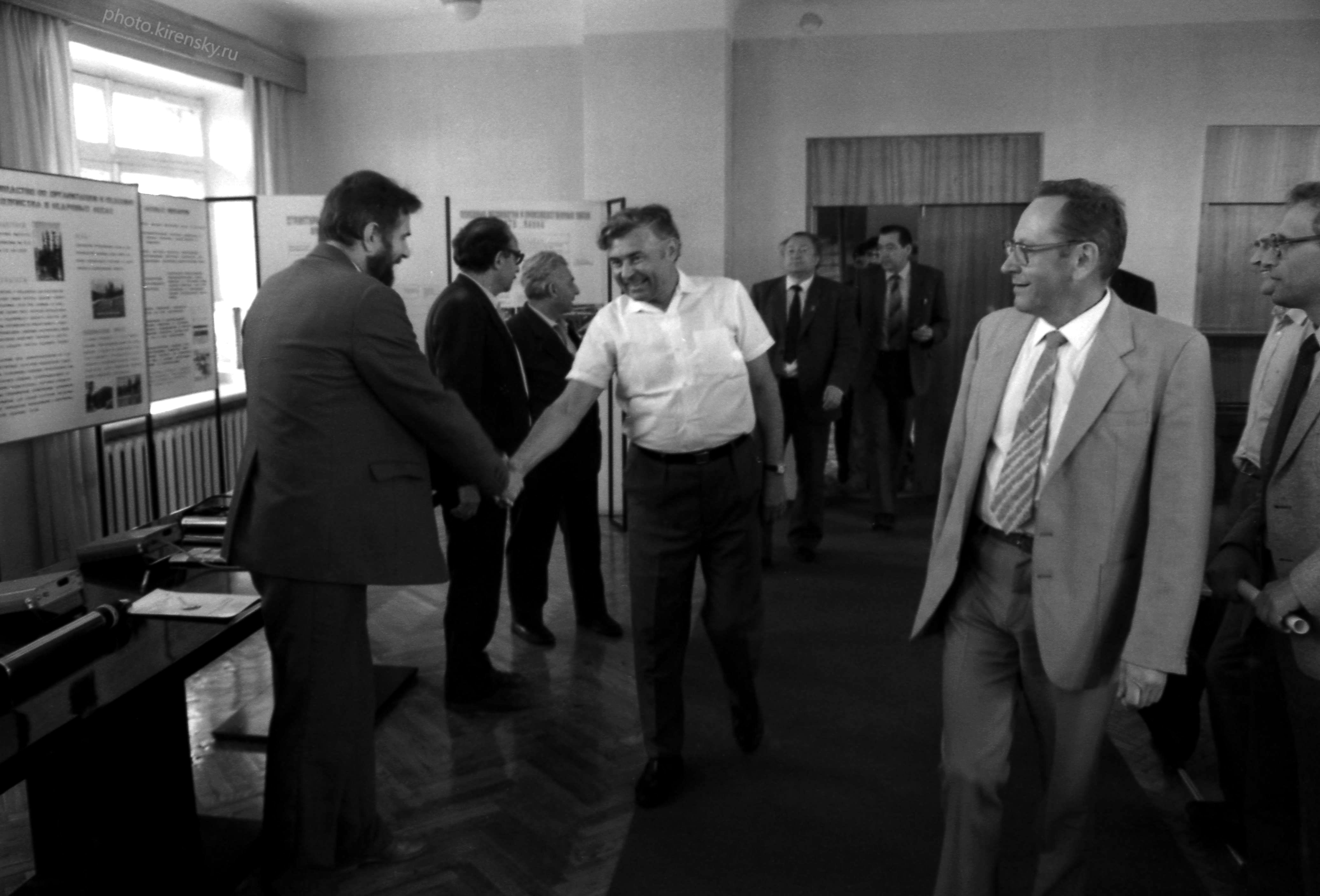 1988 год. Гурий Иванович Марчук (в центре снимка), заместитель председателя Совета Министров СССР, посетил выставку в Институте физики им. Л.В. Киренского Сибирского отделения Академии наук СССР (ИФ СО АН СССР), приуроченную к визиту Михаила Сергеевича Горбачева. Крайний справа Кирилл Сергеевич Александров, директор Института физики. Красноярск.