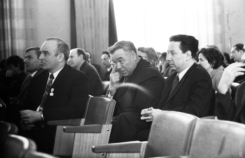 В апреле 1969 года директору Института физики Сибирского отделения Академии наук СССР (СО АН СССР с 1991 года - СО РАН) академику Л.В. Киренскому исполнилось 60 лет. На расширенном ученом Совете в конференц-зале института в честь юбиляра. В первом ряду Анистратов А.Т. (слева), Айзенберг Л.А. Во втором ряду - заместитель директора института по научной работе Дрокин А.И. (слева) и заместитель директора по научной работе Лундин А.Г. Красноярск.