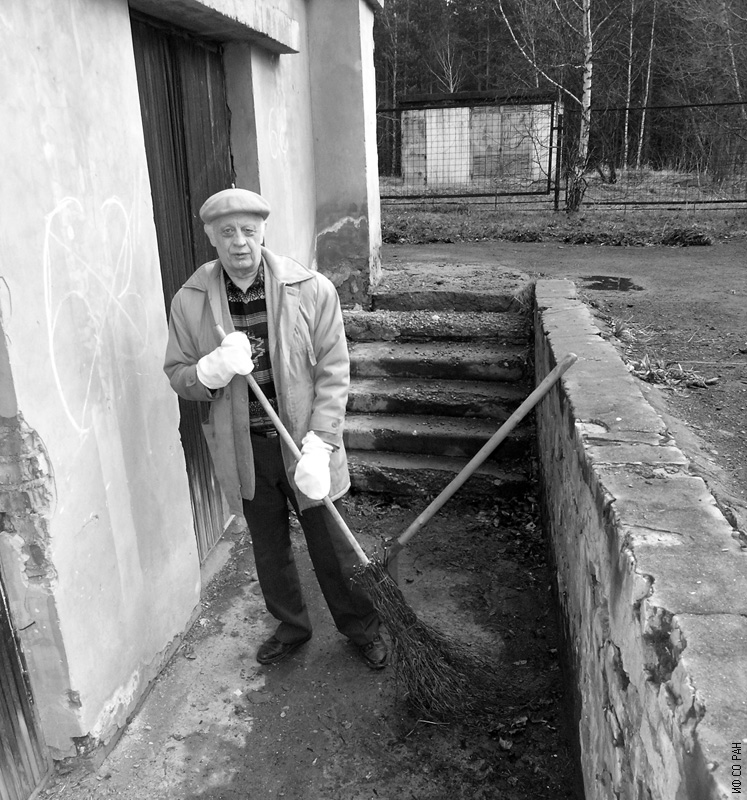 Звегинцев Анатолий Георгиевич, сотрудник Института физики им. Л.В. Киренского Сибирского отделения Российской академии наук (ИФ СО РАН), во время обще институтского воскресника на территории института, Фото 2004 года. Красноярск.