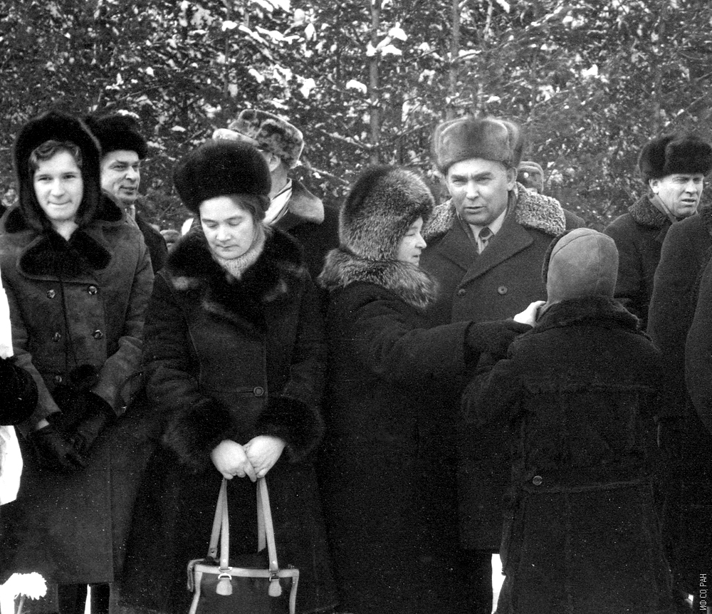 им. Л.В. Киренского Сибирского отделения Академии наук СССР. Слева внучка Ирина, дальше - дочь Татьяна Леонидовна, супруга Зинаида Яковлевна, директор Института физики Терсков Иван Александрович, 4 ноября 1974 года.