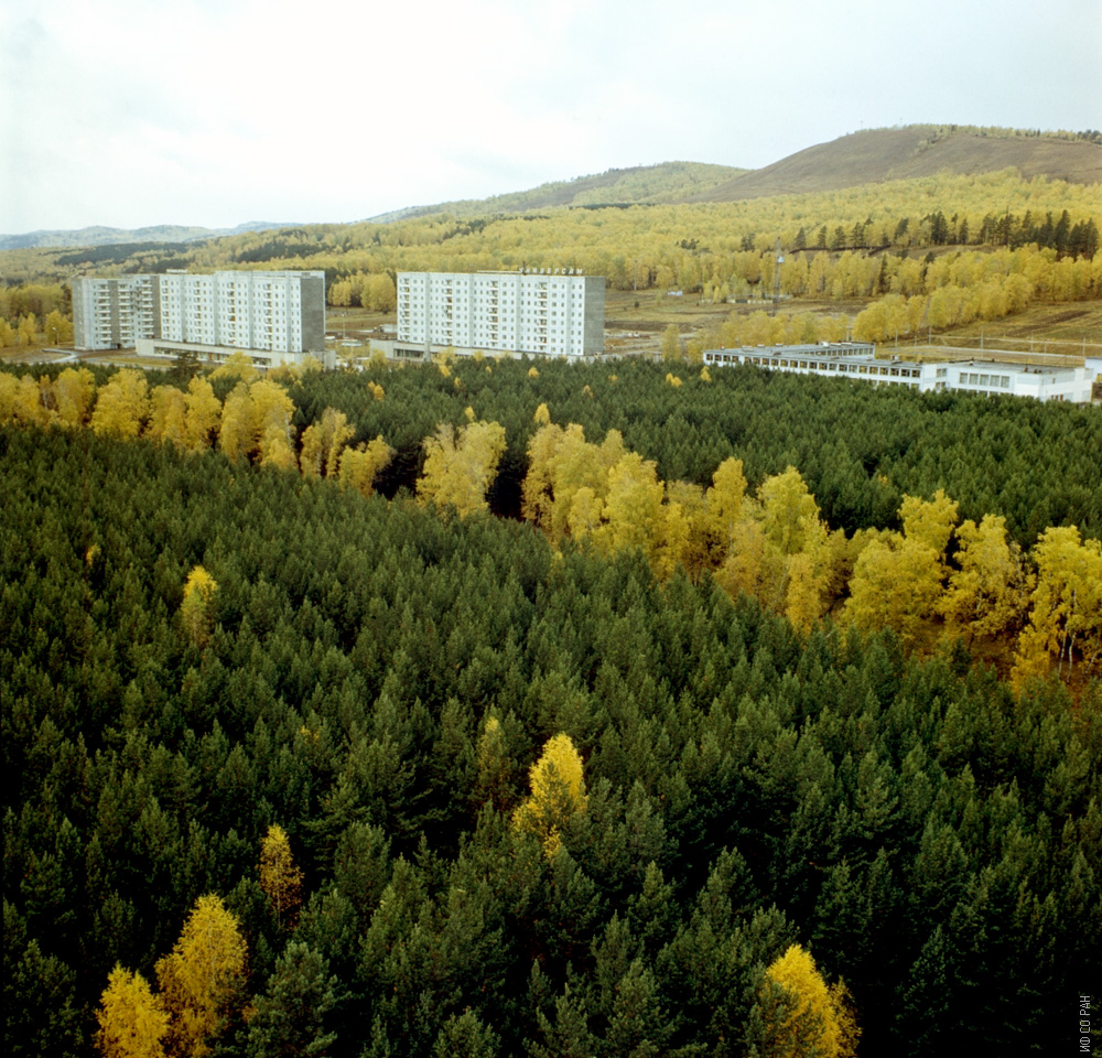 Начало строительства верхней площадки Академгородока 1979 год. Фото 1983 года. Уже построены жилые дома №№ 18, 17б и 19. Справа новая школа.
