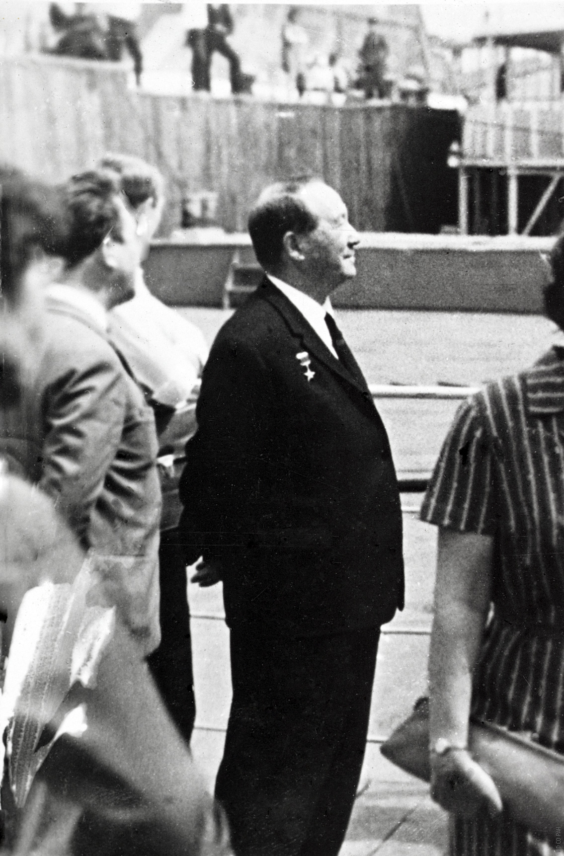 1969 год. Академик Л.В. Киренский, директор Института физики Сибирского отделения Академии наук СССР, на пристани речного вокзала в Красноярске провожает теплоход «А. Матросов», на котором отправляются в рейс участники конференции по биофизике.Конференция была организована и проведена Институтом физики.