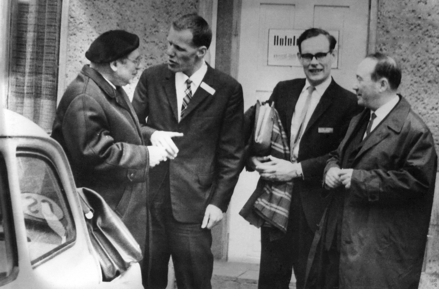 1966 год. На втором Международном симпозиуме по тонким магнитным пленкам (в городе Йена Германская Демократическая Республика). Л.В. Киренский (крайний справа), организатор и первый директор Института физики Сибирского отделения Академии наук СССР. Поскольку пленочное состояние вещества в те годы привлекало не только внимание исследователей, но и решительно вторгалось в технику, был создан Интернациональный организационный комитет по тонким магнитным пленкам под председательством профессора Л. Валенты. По решению комитета (начиная с 1964 года) такие Международные симпозиумы проводились каждые два года. Первый был проведен в 1964 году в ......, а второй в 1966 году в городе Йена в Германской Демократической Республике.