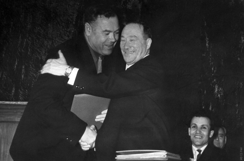 7 апреля 1969 года у академика Л.В. Киренского (справа), организатора и первого директора Института физики Сибирского отделения Академии наук СССР (ИФ СО АН СССР) юбилей. Ему исполнилось 60 лет. Леонид Васильевич принимает поздравление от ректора Красноярского государственного университета Александра Ивановича Дрокина. Красноярск.