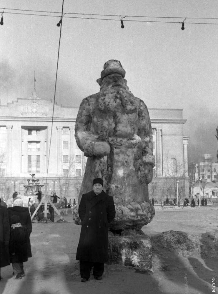 1950 год. Академик Л.В. Киренский, заведующий кафедрой теоретической физики в Красноярском государственном педагогическом институте, на центральной площади Красноярска в новогодние праздники.