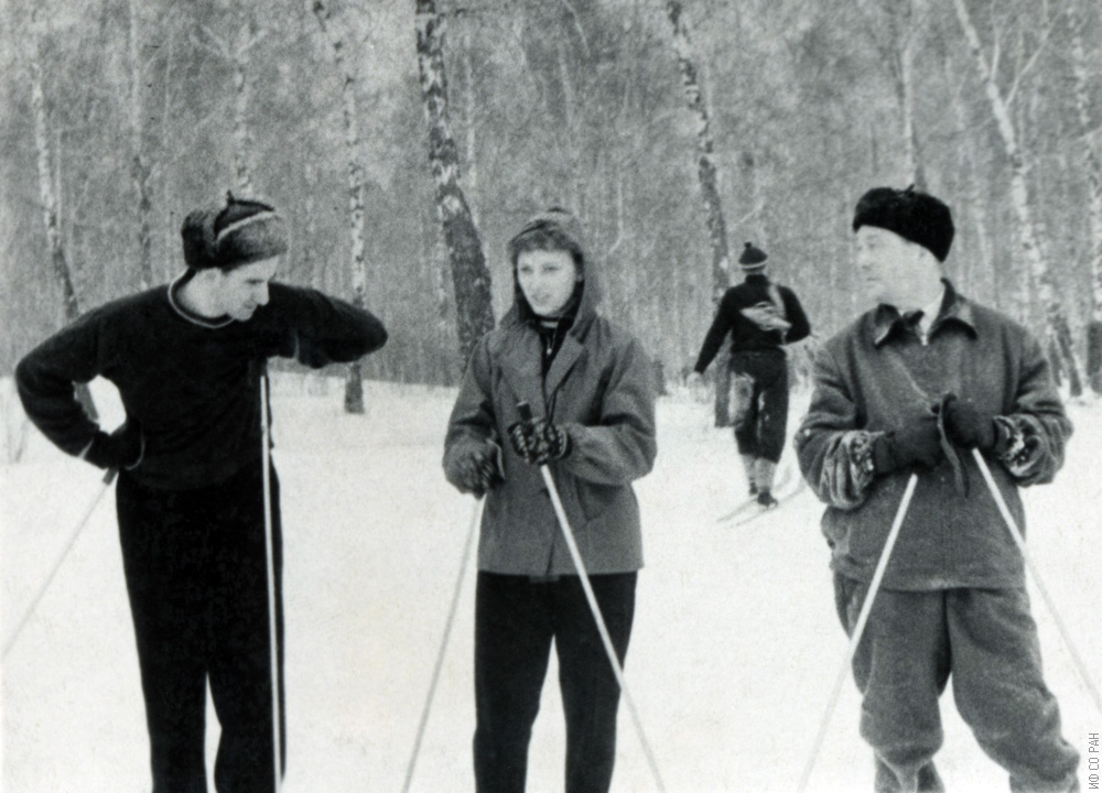 Зимние старты в роще Академгородка Красноярска, в которых, как правило, участвовал Леонид Васильевич Киренский, организатор и первый директор (крайний справа) Института физики Сибирского отделения Академии наук СССР (ИФ СО АН СССР), фото 1960 года.