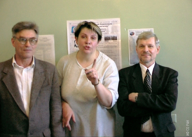 На конференции по новым магнитным материалам в микроэлектронике, прошедшей на физико-математическом факультете Московского Государственного университета (МГУ) в 1998 году. Сотрудники Института физики им. Л.В. Киренского Сибирского отделения Российской академии наук (ИФ СО РАН) (слева направо): Поцелуйко А.А., Староверова И.В., Беляев Б.А. Москва.