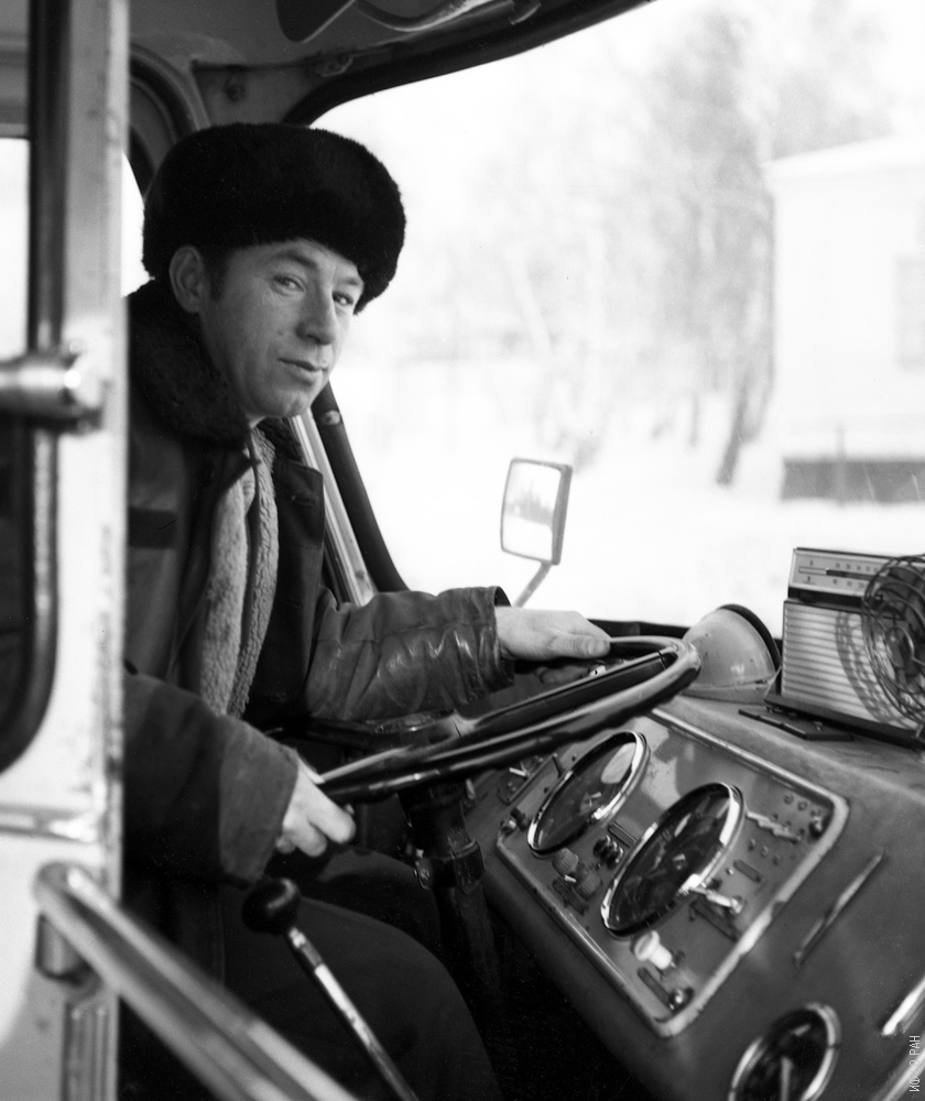 Безносов Юрий Михайлович, водитель автобуса Института физики им. Л.В. Киренского Сибирского отделения Академии наук СССР (ИФ СО АН СССР), фото 1973 года. Красноярск.
