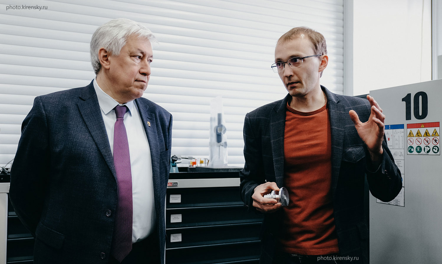 3 апреля 2025 года состоялось выездное заседание Президиума Сибирского отделения Российской академии наук (СО РАН) в Красноярске. Члены Президиума СО РАН посетили некоторые лаборатории и мемориальный музей академика Л. В. Киренского в Институте физики им. Л.В. Киренского Сибирского отделения Российской академии наук (ИФ СО РАН). На снимке: в лаборатории научного приборостроения академик Маркович Дмитрий Маркович (слева), заместитель председателя Президиума СО РАН, директор Института теплофизики им. С.С. Кутателадзе СО РАН и заведующий лабораторией кандидат физико-математических наук Боев Никита Михайлович.