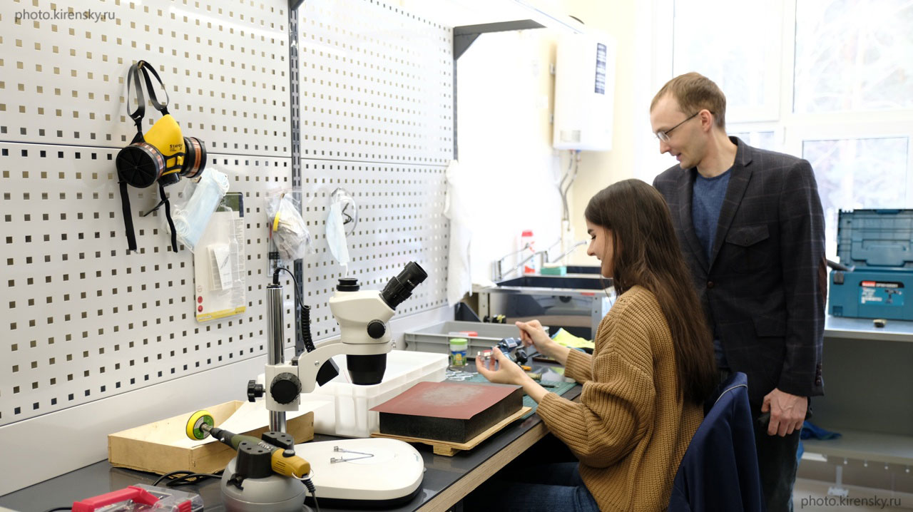 Боев Никита Михайлович, заведующий лабораторией научного приборостроения Института физики им. Л.В. Киренского Сибирского отделения Российской академии наук и Негодеева Ирина Александровна, инженер лаборатории электродинамики и СВЧ электроники, в лаборатории научного приборостроения. Снимок 2025 года