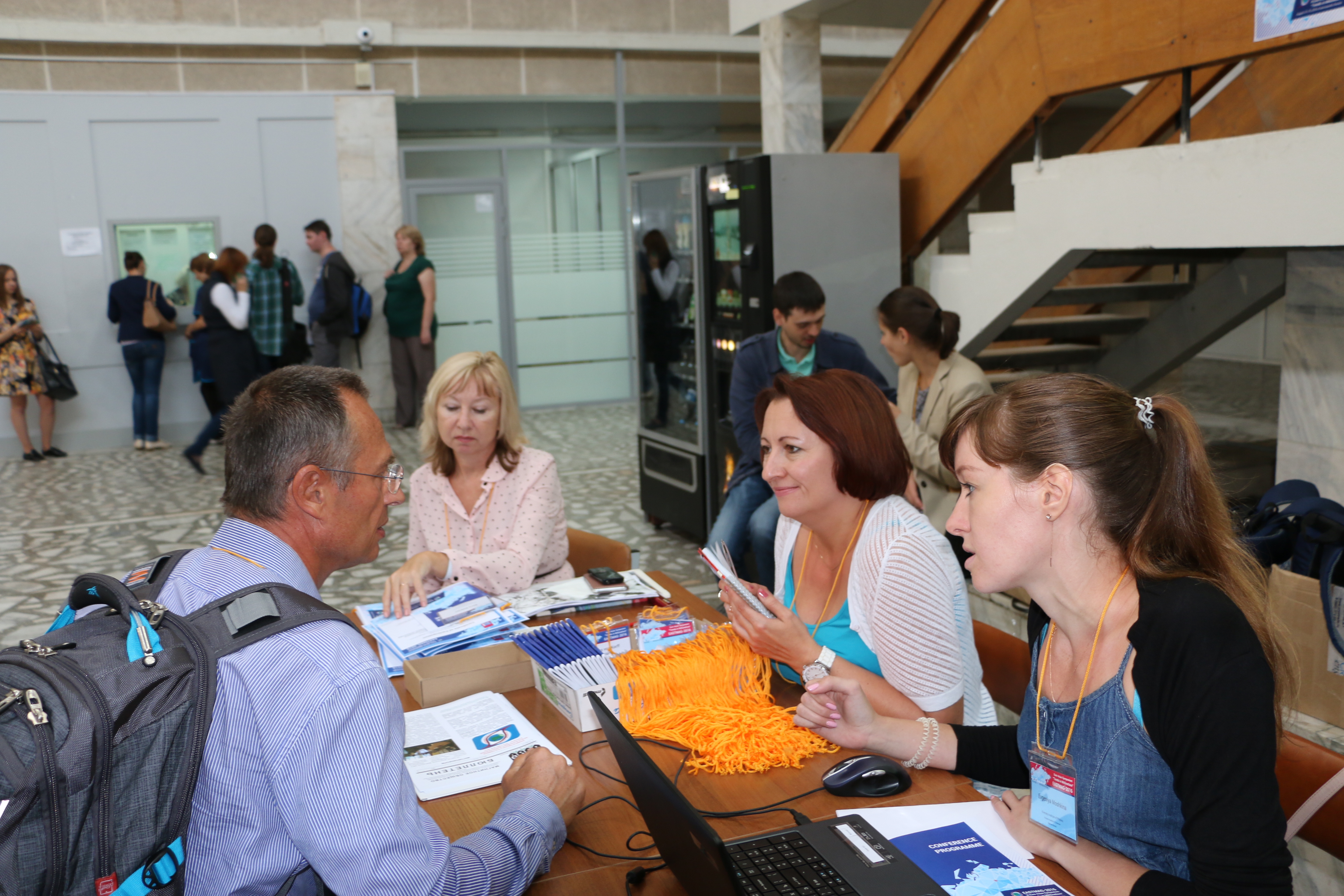 Регистрация участников Евро-Азиатского симпозиума "Прогресс в магнетизме" (EASTMAG-2016), организованного и проведенного в Красноярске в 2016 году. На снимке слева направо: Рассел Каубёрн (Кембридж), Ольга Бруштунова, Елена Бондарева и Евгения Мошкина. Красноярск.