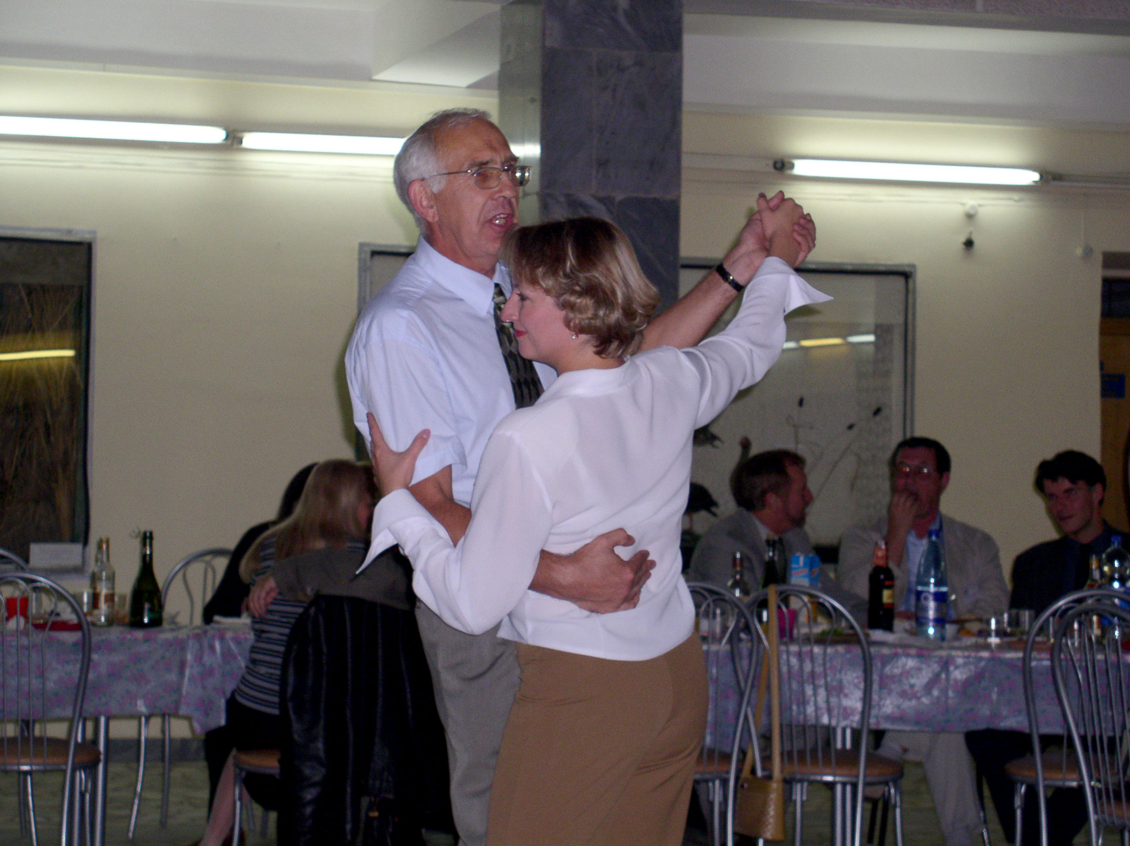 Август 2004 г. Заключительный банкет Евро-Азиатского симпозиума по магнетизму (EASTMAG-2004), организованного и проведенного в Красноярске. Тур вальса Овчинникова С.Г. с Бондаревой Е.В.