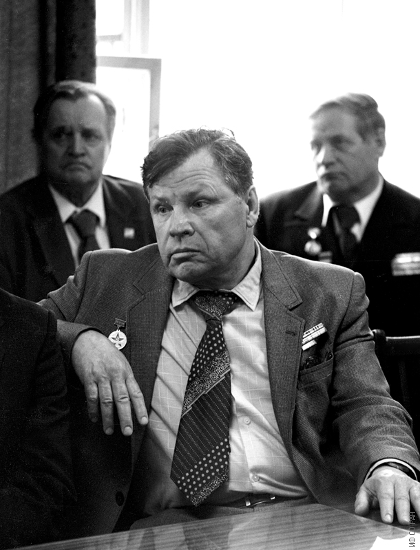 Участники Великой Отечественной войны (1941-1945 гг.). На переднем плане, Изотов Иван Александрович, за ним: Мейер Петр Иосифович (слева) и Буркацкий Александр Михайлович, сотрудники Института физики им. Л.В. Киренского Сибирского отделения Академии наук СССР (ИФ СО АН СССР), на торжественном заседании, посвященном Дню Победы 9 мая 1981 года. Красноярск.