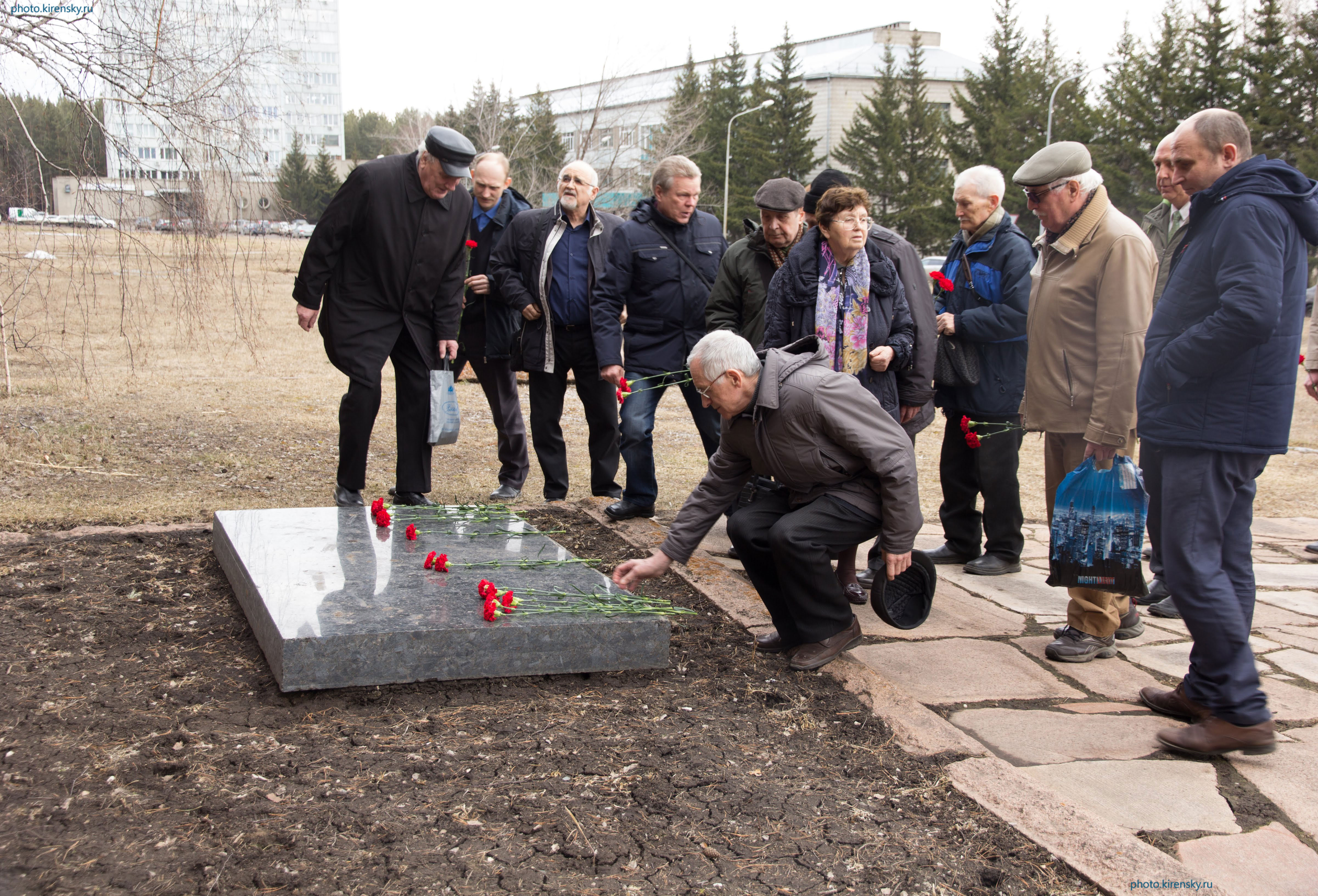 8 апреля 2018 года. Участники торжественного заседания ученого Совета Института физики им. Л.В. Киренского Сибирского отделения Российской академии наук, посвященного 109 -ой годовщине со дня рождения организатора и первого директора института академика Леонида Васильевича Киренского, возлагают цветы на его могиле в Академгородке Красноярска, где он похоронен.