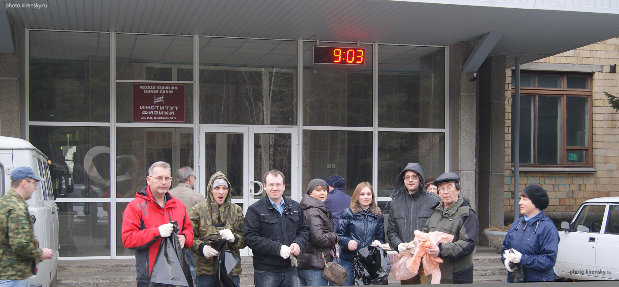 2015 год. Участие сотрудников лаборатории физики магнитных явлений Института физики им. Л.В. Киренского Сибирского отделения Российской академии наук в весеннем субботнике по уборке территории института, слева направо: Дудников В.А., Сухачев А.Л., Косырев Н.Н., Яковлева Е.В., Самошкина Ю.Э., Петров Д.А., Худяков А.Е., Мащенко В.В. 2015 год