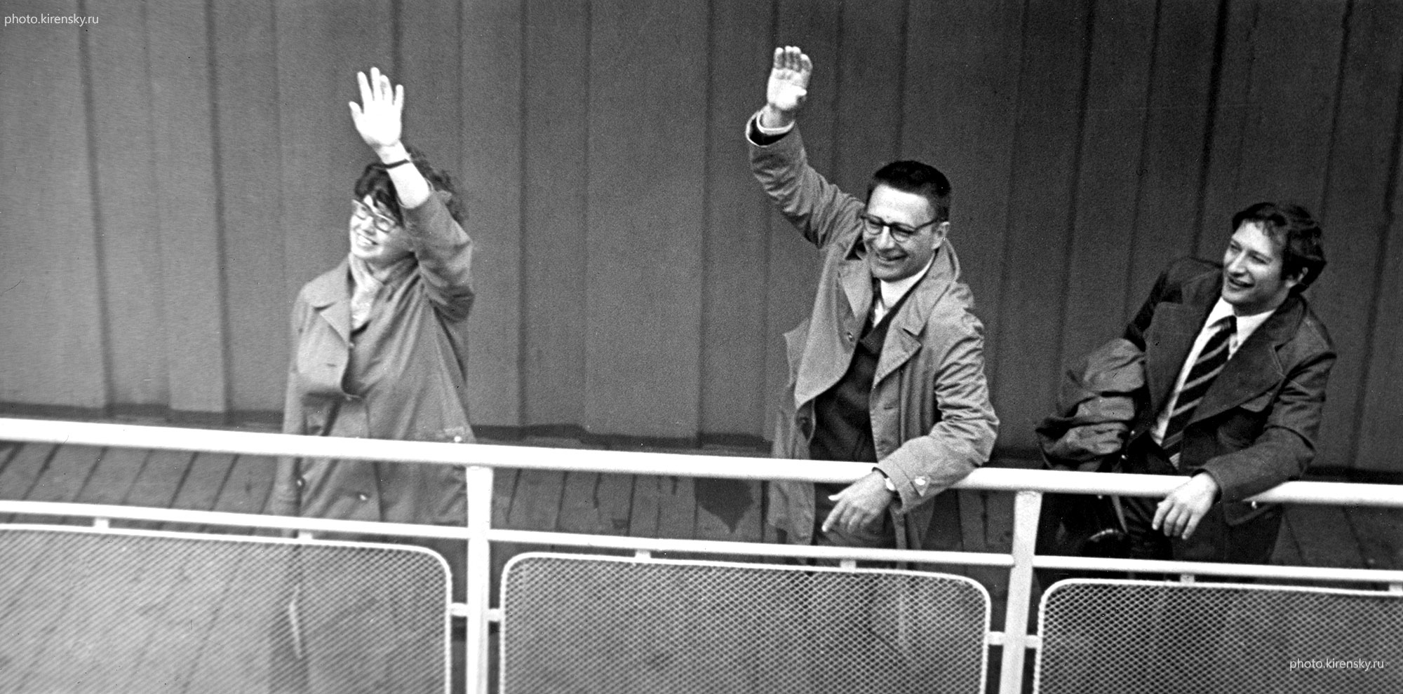 Эдельман И. С., Игнатченко В. А., Киренский Л. В. (справа) на пристани речного вокзала Красноярска провожают участников Всесоюзного совещания по физическим свойствам монокристаллов ферритов, организованного на теплоходе «В. Чкалов» (рейс Красноярск-Дудинка-Красноярск) Институтом физики Сибирского отделения Академии наук СССР (ИФ СО АН СССР). Совещание проходило с 24 июня по 4 июля 1969 года.