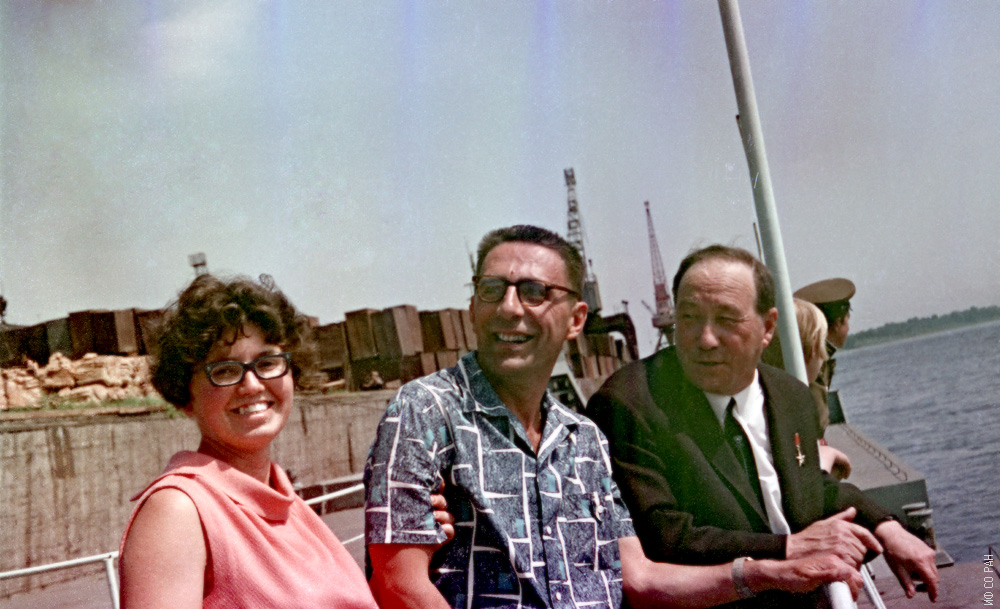 1962 год. Международный симпозиум по вопросам ферро- и антиферромагнетизма, организованный и проведенный Институтом физики Сибирского отделения Академии наук СССР (ИФ СО АН СССР) на теплоходе «А. Матросов». Рейс Красноярск – Дудинка – Красноярск. На борту теплохода момент отплытия участников симпозиума: Эдельман Ирина Самсоновна Игнатченко Вальтер Алексеевич (в центре) и Бержанский Владимир Наумович.