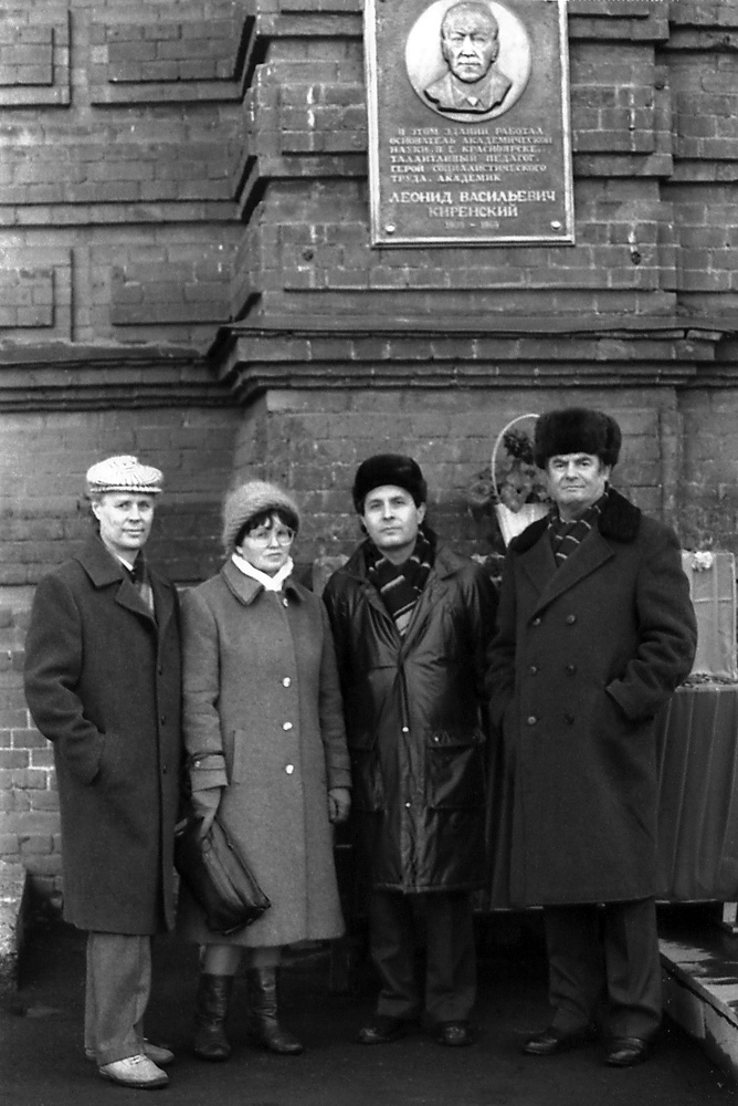 Хрусталев Б. П., Эдельман И. С., Захаров Ю. В., Антипин И. П. (слева направо), сотрудники Института физики им. Л.В. Киренского Сибирского отделения Академии наук СССР, после открытия в 1988 году мемориальной доски на здании Красноярского государственного педагогического института (работа Заслуженного художника России В.А. Зеленова). На ней написано: «В этом здании работал основатель академической науки в г. Красноярске, талантливый педагог, Герой Социалистического Труда, академик Леонид Васильевич Киренский (1909-1969)».