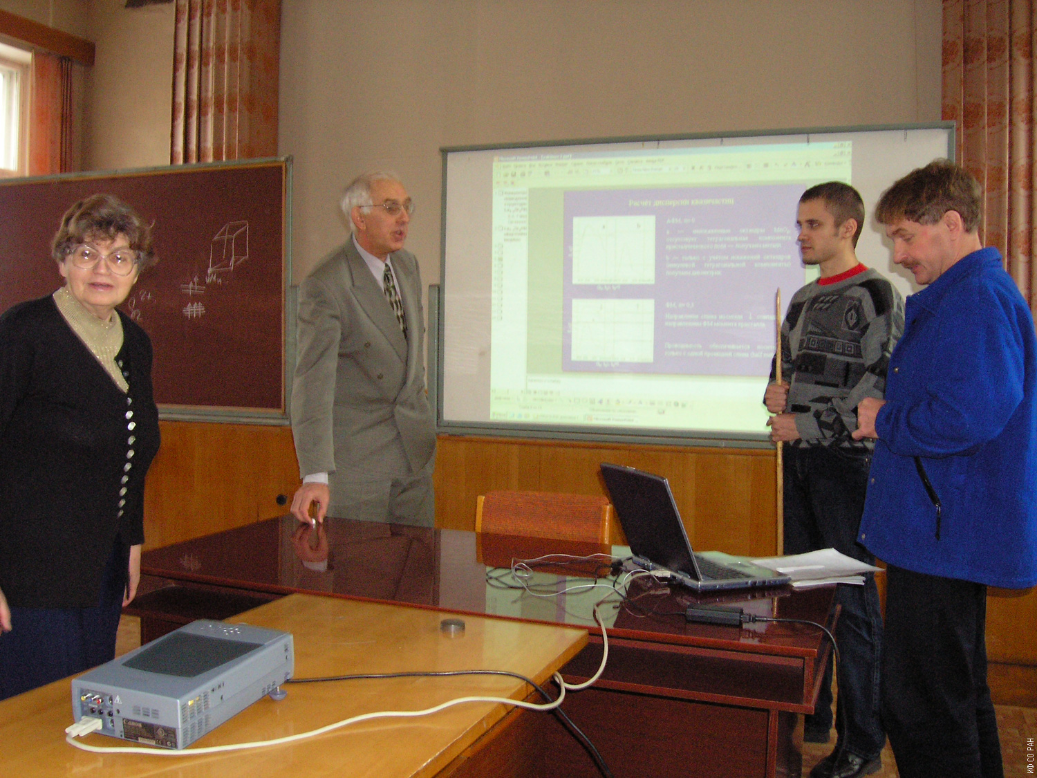 Слева направо: Эдельман И.С., Овчинников С.Г., Якимов Л.Е., Гавричков В.А., сотрудники лаборатории физики магнитных явлений Института физики им. Л.В. Киренского Сибирского отделения Российской академии наук (ИФ СО РАН), на семинаре лаборатории, на котором обсуждалась диссертационная работа аспиранта Льва Якимова. Снимок 2006 года. Красноярск.