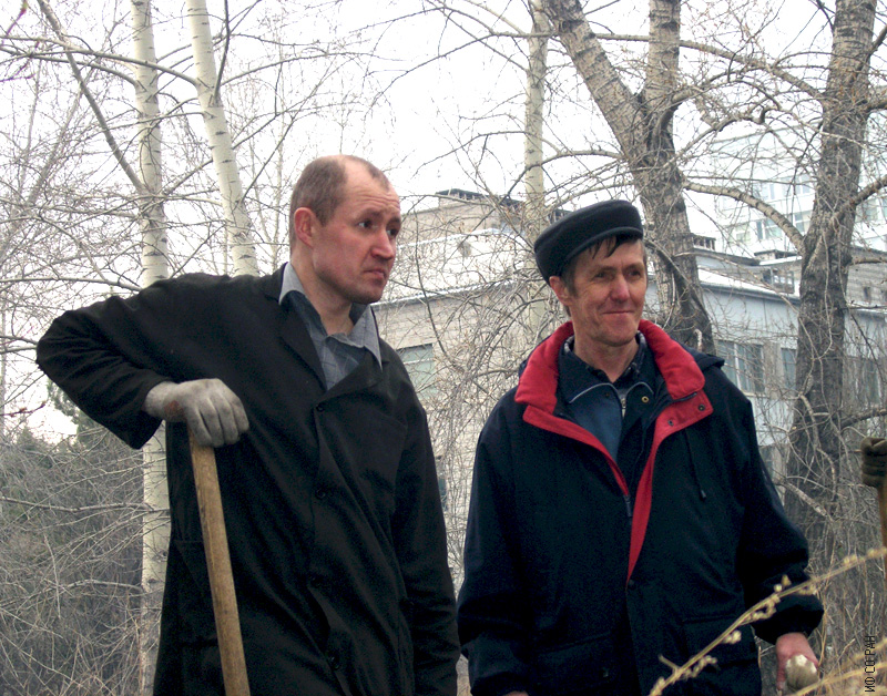 Фатов М.В., сотрудник экспериментальных механических мастерских и Агапов А.В., заместитель директора по административно-хозяйственной работе Института физики им. Л.В. Киренского Сибирского отделения Российской академии наук (ИФ СО РАН) (справа), на ежегодном общеинститутском субботнике по уборке территории института. Снимок 2004 года. Красноярск.