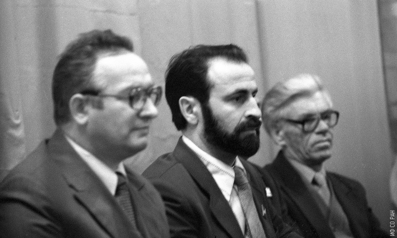 1986 год. Научные чтения, посвященные памяти академика Л.В. Киренского, организатора и первого директора Института физики Сибирского отделения Академии наук СССР (ИФ СО АН СССР), с участием сотрудников институтов Красноярского Научного центра СО АН СССР и жителей Академгородка. Во втором ряду (слева направо) Фиш А.М., Хрусталёв Б.П., Степанов Г.Н. Красноярск.