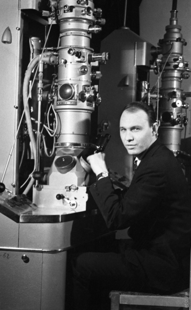 1970 год. Комалов А. С., сотрудник лаборатории магнитных монокристаллических пленок Института физики Сибирского отделения Академии наук СССР (ИФ СО АН СССР), за исследованием доменной структуры тонких магнитных пленок на электронном микроскопе УЭМВ-100. В этом году он защитил диссертацию на соискание ученой степени кандидата физико-математических наук. Красноярск.