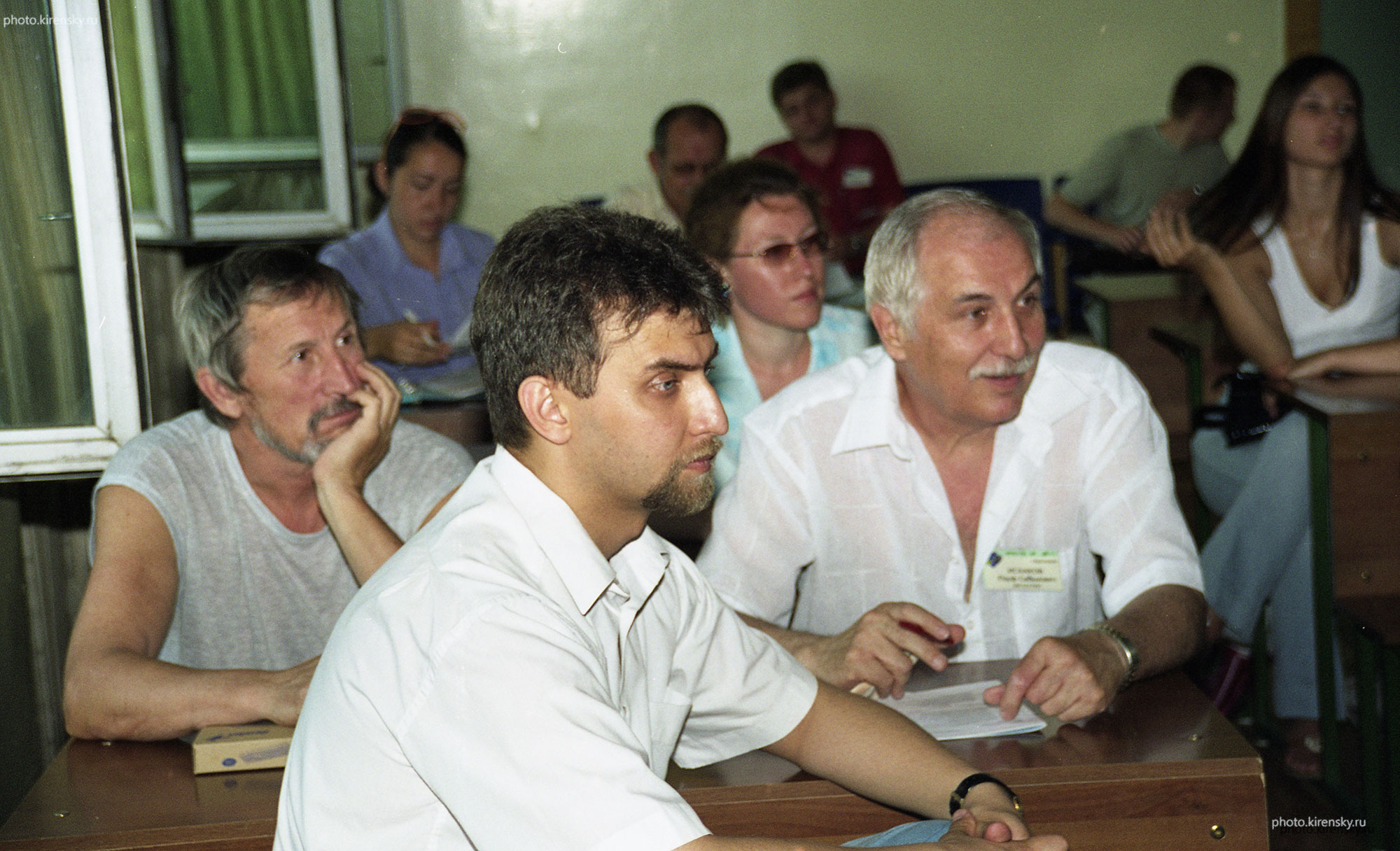 В конференц-зале Института физики им. Л.В. Киренского Сибирского отделения Российской академии наук (ИФ СО РАН). На переднем плане: Комогорцев Сергей Викторович (слева), старший научный сотрудник лаборатории физики магнитных пленок и Жарков Сергей Михайлович, старший научный сотрудник лаборатории когерентной оптики. Снимок 2005 года. Красноярск.