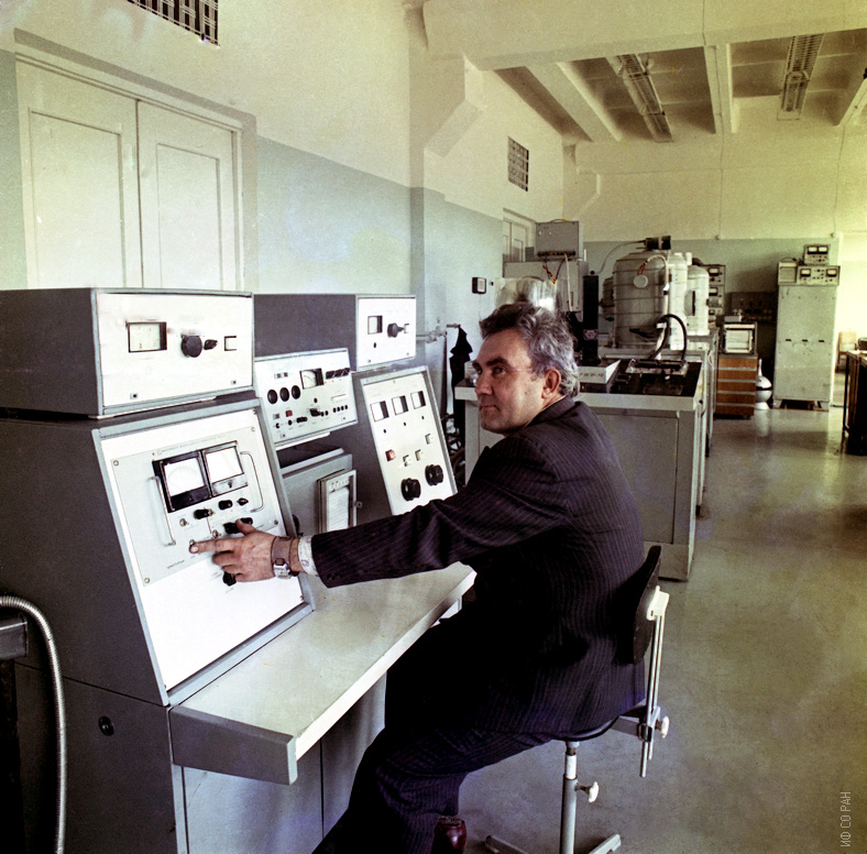 1967 год. В.П. Кононов, ведущий инженер лаборатории высокочастотных и импульсных свойств тонких магнитных пленок Института физики Сибирского отделения Академии наук СССР (ИФ СО АН СССР) (СО АН СССР с 1991 года СО РАН), за вакуумной установкой УНУ-1 для напыления пленок. Красноярск.