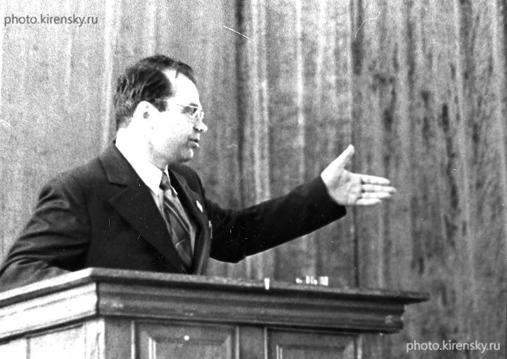 Ковров Борис Григорьевич, заведующий лабораторией моделирования и конструирования замкнутых систем Института физики им. Л.В. Киренского Сибирского отделения Академии наук СССР, с докладом на заседании ученого Совета Института физики, посвященного памяти академика Л.В. Киренского в 1974 году.