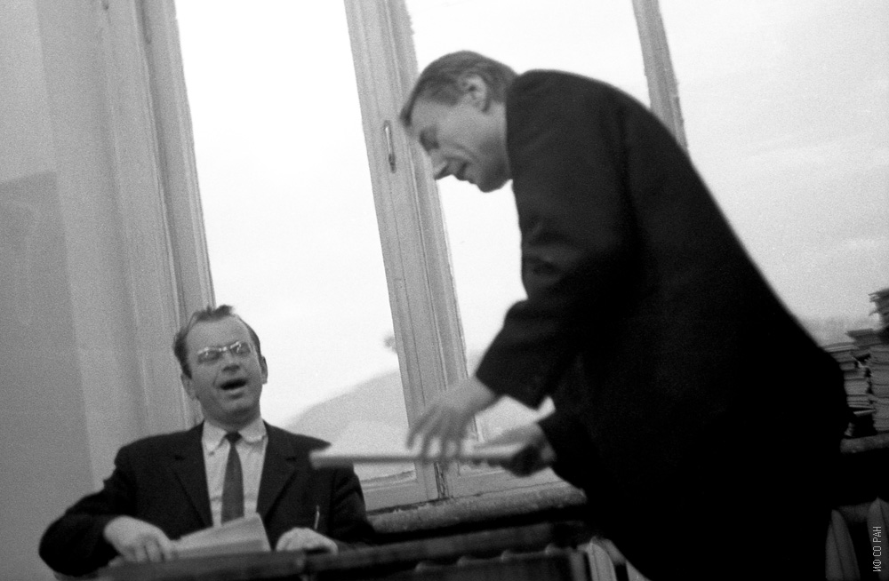 Терсков И.А. (слева), директор Института физики им. Л.В. Киренского Сибирского отделения Академии наук СССР (ИФ СО АН СССР) и Ковров Б.Г., заведующий лабораторией моделирования замкнутых систем Института физики, в президиуме заседания, посвященного памяти академика Л. В. Киренского, организатора и первого директора института. 7 апреля 1974 года. Красноярск.