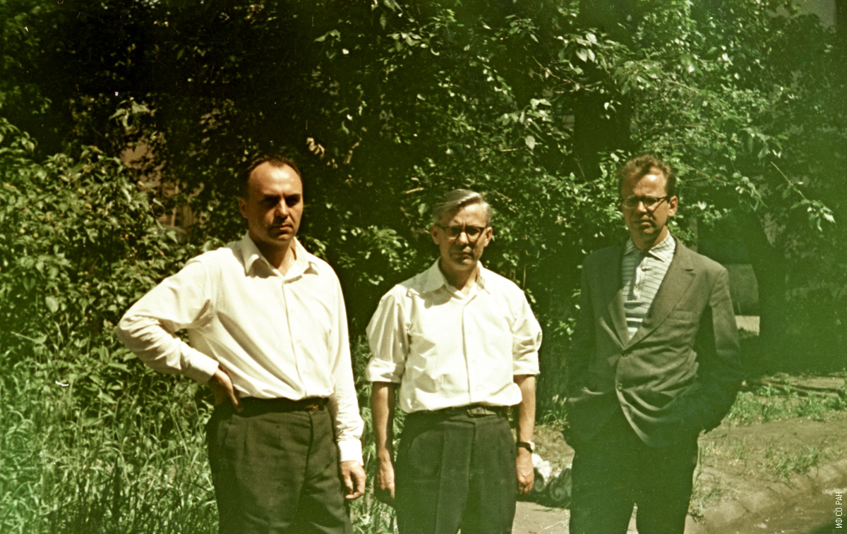 1969 год. Слева направо: Лисовский Г. М., заведующий лабораторией управляемого биосинтеза, Сидько Ф. Я., заведующий лабораторией биологической спектроскопии, Ковров Б. Г., заведующий лабораторией моделирования и конструирования замкнутых систем Института физики Сибирского отделения Академии наук СССР. Красноярск.