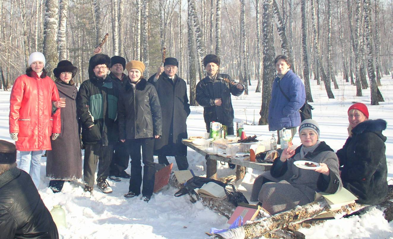 8 марта 2004 года. Сотрудники лаборатории молекулярной спектроскопии Института физики им. Л.В. Киренского Сибирского отделения Российской академии наук (ИФ СО РАН). Слева направо: Прищепа О.О., Крылова С.Н., Крылов А.С., Шестаков Н.П., Пястолова Ю.В., Шабанов В.Ф., Гуняков В.А., Баранник А.В., Гайнутдинова А.Ш., Подопригора Е.Н. Красноярск. Роща Академгородка.
