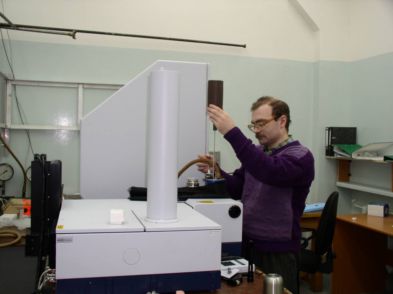 Крылов Александр Сергеевич, старший научный сотрудник лаборатории молекулярной спектроскопии Института физики им. Л.В. Киренского Сибирского отделения Российской академии наук (ИФ СО РАН), проводит температурные измерения спектров комбинационного рассеяния (КР) на Bruker RFS-100/S. Снимок 2004 года. Красноярск.